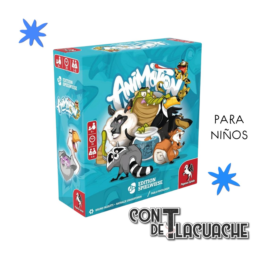 Para preparar Animotion, antes conocido como Animal Suspect, coloca seis cartas de animales y seis cartas de expresiones en el tablero junto a las caras del dado numeradas del 1 al 6. En cada turno, un jugador lanza dos dados en secreto, observa las cartas que coinciden con los números obtenidos y luego imita esa combinación lo mejor posible. ¿Será un mosquito tímido? ¿Una morsa atenta? ¿Un pulpo enamorado?