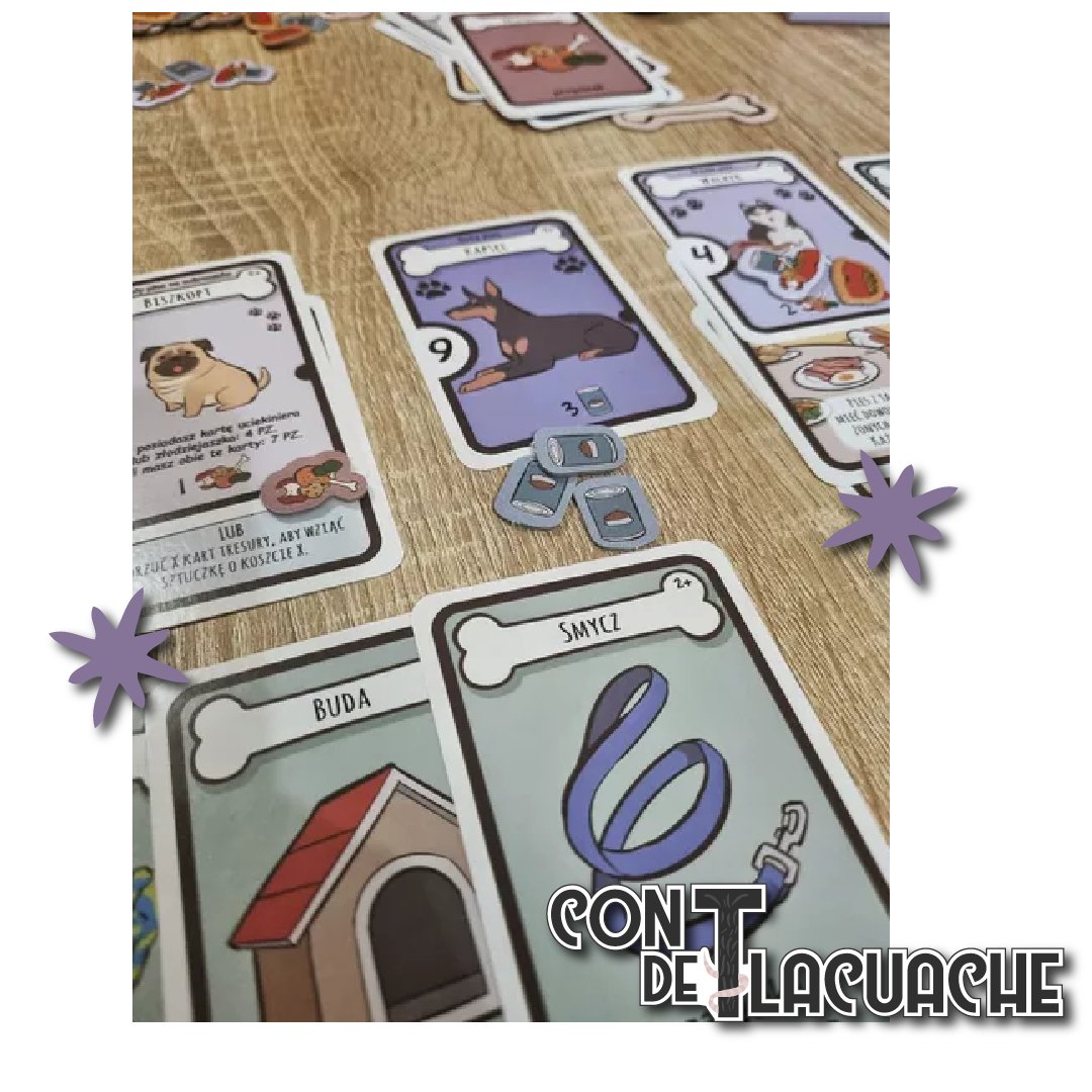 Para empezar, recibes una carta de perro al azar, que puede ser pequeño, mediano o grande, y una carta de "truco especial" al azar. Después, baraja las cartas del juego y coloca las nueve primeras cartas en una cuadrícula de 3x3. A continuación, coloca tres cartas de truco de perro en una columna adyacente y tres perros rescatados en otra columna. El jugador más lejos del jugador inicial coloca el token de perro guardián al lado de una de las filas o columnas, ¡y listo para jugar!