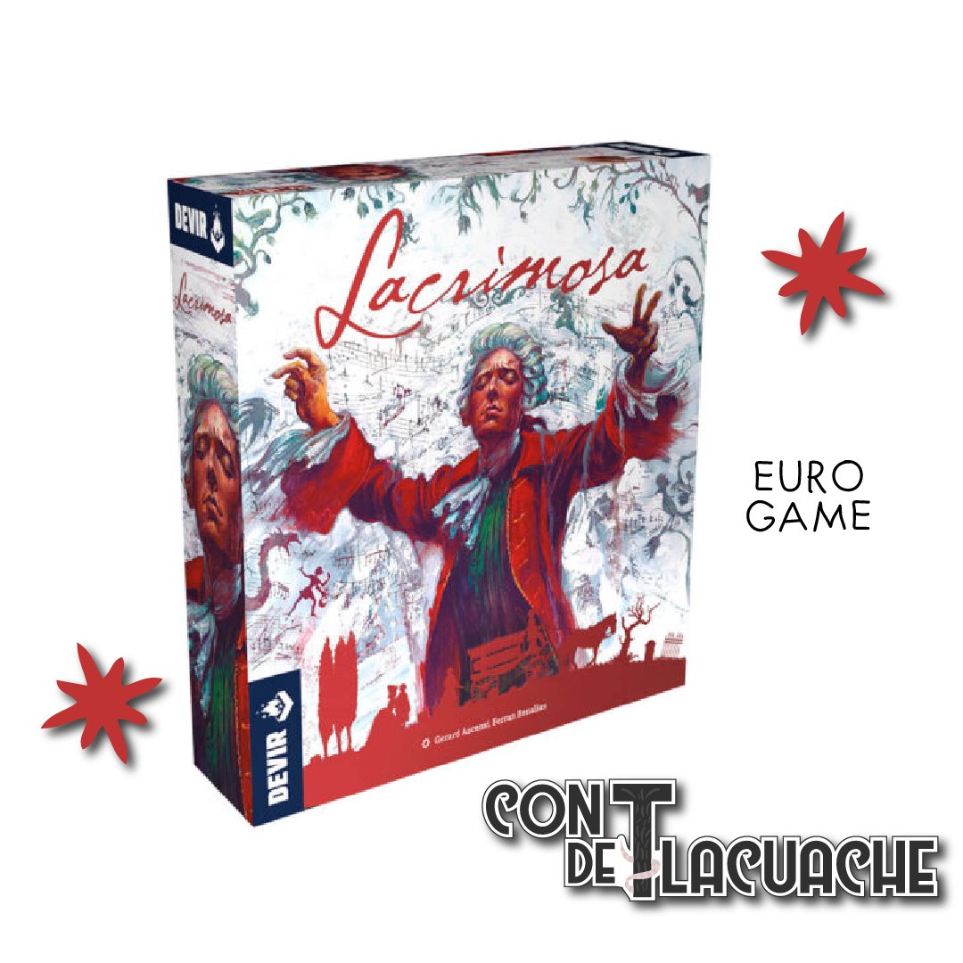 Con mecánicas de construcción de mazos y gestión de mano, Lacrimosa se juega a lo largo de 5 rondas en las que recordarán memorias compartidas, encargando, representando y vendiendo obras a través de los escenarios y las cortes más fastuosas del continente… Y, por supuesto, ayudar a completar el Réquiem, que dejó inconcluso. ¿Lograrás honrar el legado de uno de los mayores compositores de todos los tiempos y pasar a la posteridad junto a él?